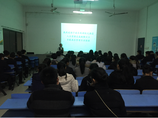 (旅游商务系 罗志珍 报道)2016年11月24日晚上19:00—20:30,旅游商务系餐旅教研室邀请宁波东钱湖恒元酒店行政人力资源总监殷梅来校开展“我的十三年”专题讲座,15级酒店管理(英语实验)班和15级中专高星级饭店运营与管理班70余名学生到场聆听讲座。