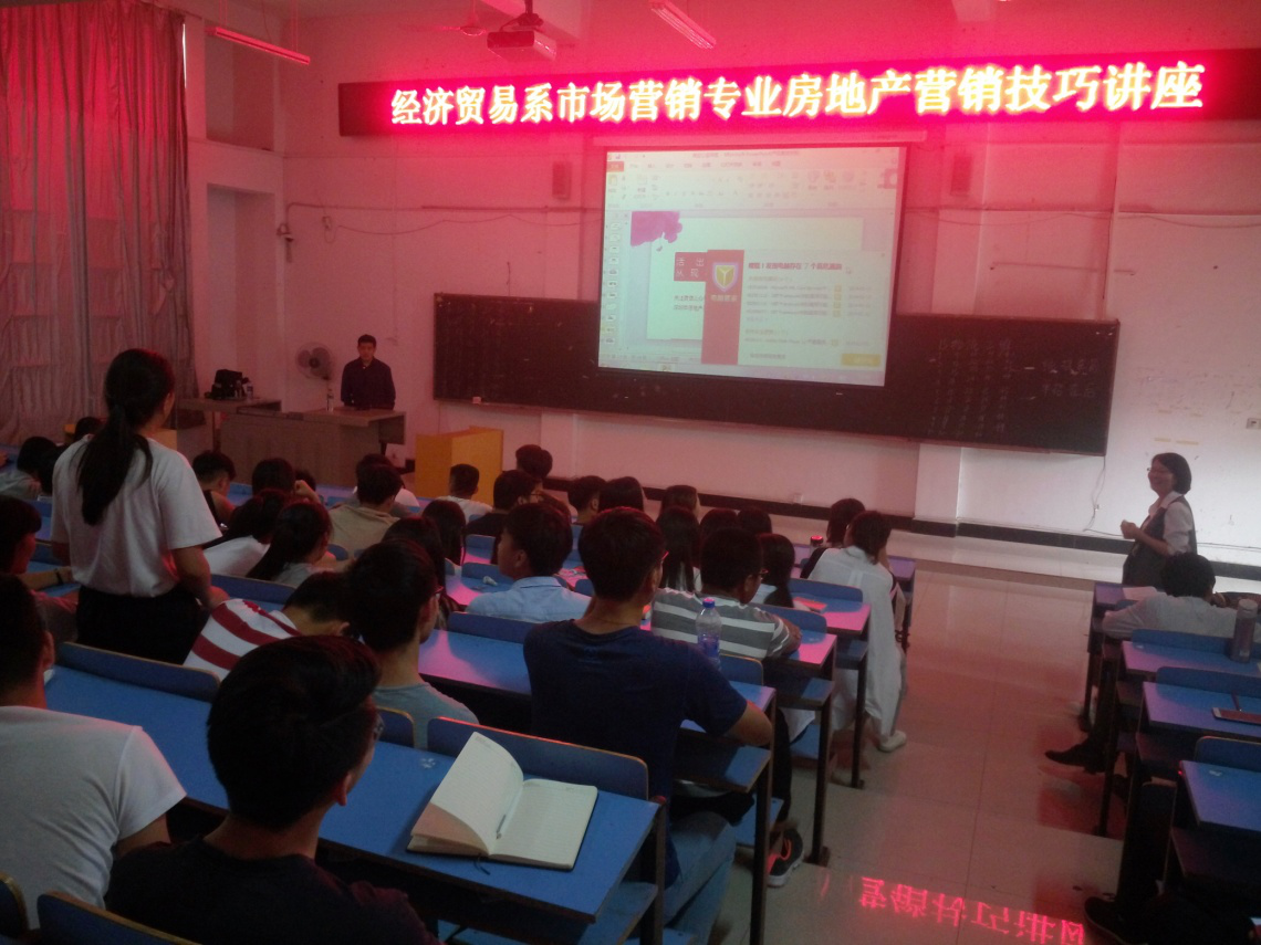 经济贸易系于2017年5月15日下午14:30在第一教学楼113教室,召开企业进校园专题讲座。深圳中原地产公司高级招聘经理陈振华为此次讲座主讲人,招聘专员刘兰兰现场与学生互动解答提出的问题。经济贸易系教研室主任胡丽娟、经贸系教师罗继平、蒋雯以及章盈参加了此次讲座。陈经理围绕如何进行销售进行了讲演,陈经理的演讲和魅力让在场的同学折服。