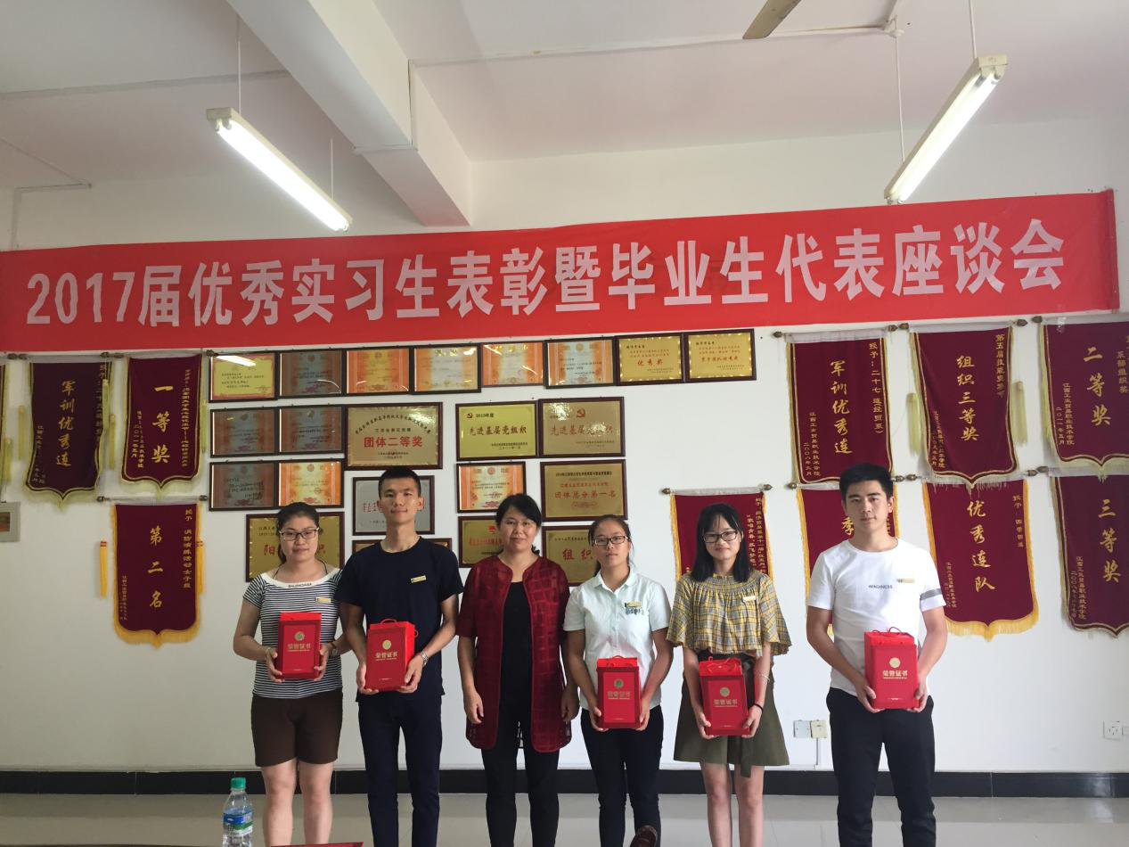 “力尽不知热,但惜夏日长”。在这七月流火的酷暑时节,为继续实施 “招生就业”双轮驱动,表彰先进与树立榜样,江西工贸学院经济贸易系利用2017届毕业生返校领取毕业证之际,7月22日下午在一专320会议室组织召开2017届优秀实习生表彰大会暨毕业生代表座谈会。学院党委委员、副院长赵淑华、经济贸易系主任李运楼、副主任陶晓峰和何静、南昌国峰健康管理有限公司人力资源总监胡荣峰、校内实习指导老师代表、辅导员代表以及2017届优秀实习生和毕业生代表出席了座谈会,会议由经济贸易系何静副主任主持。