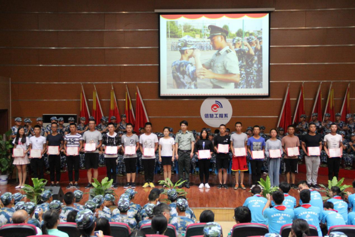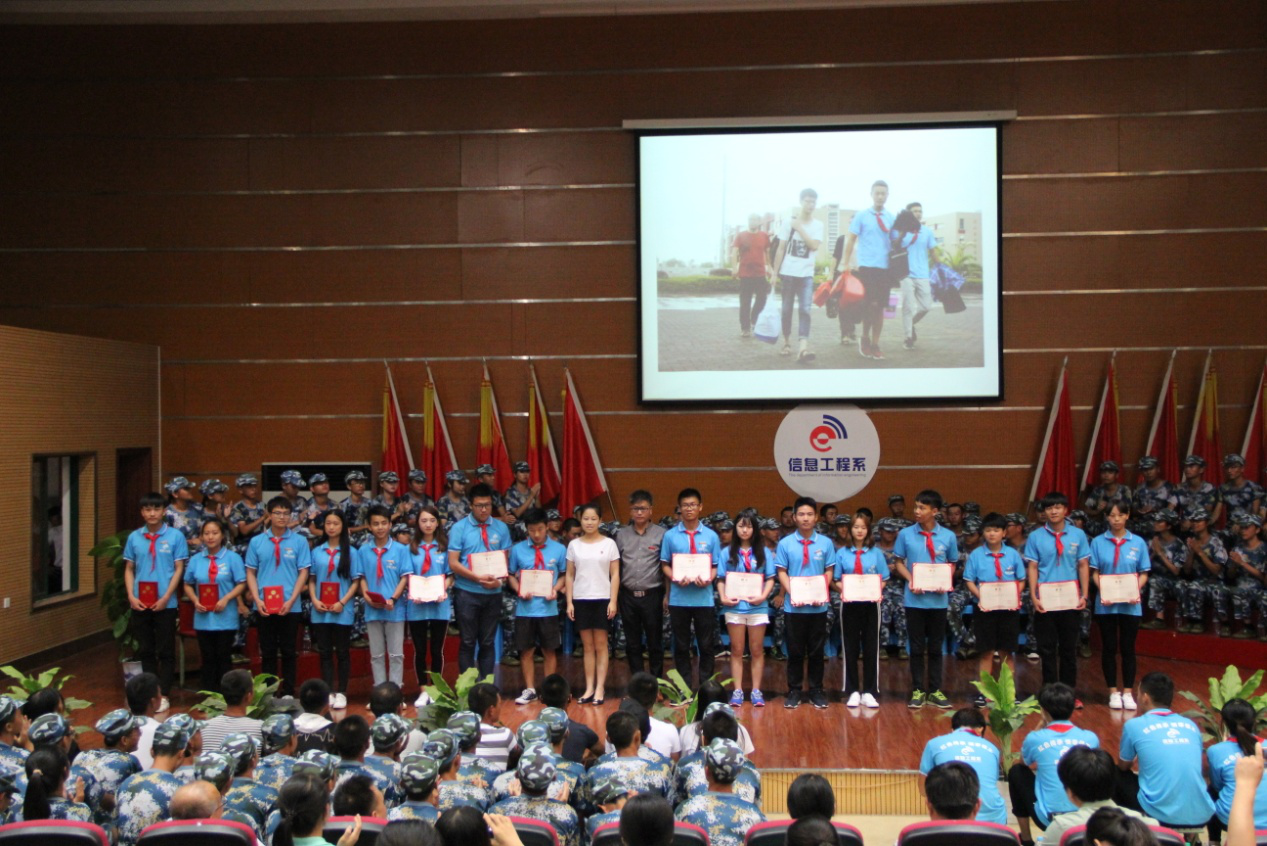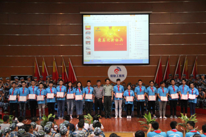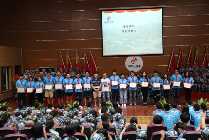 接着,对信息工程系2017级新生接待“最美迎新标兵” 、16名军训教官以及在学院第十二届“红五月”文化艺术节活动及2017年“三走”教育系列活动中先进集体进行了表彰,并对2017级助理辅导员颁发了聘书,院系领导为获奖的同学和团体代表颁奖并合影。