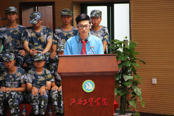 2015级优秀学生代表15计网3班游鹏飞在发言中回顾了自己在工贸生活学习的点点滴滴以及两年新生接待工作的感想。他鼓励新生在接下来的日子里多尝试多探索,努力培养自己的自学能力,写好自己的工贸故事。游鹏飞的发言风趣幽默,引发了现场同学的阵阵笑声和掌声。