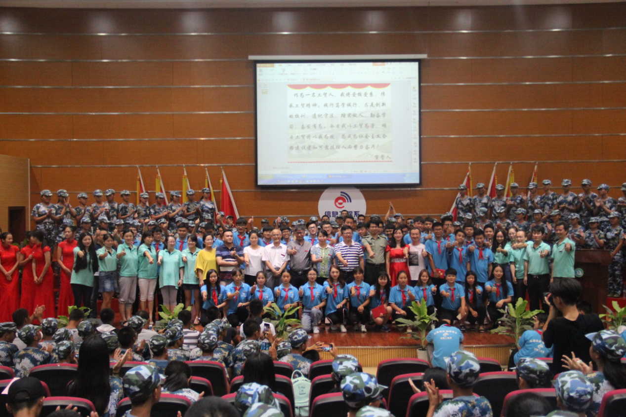 典礼最后,大家一起共唱校歌《同心创辉煌》,并同时一同佩戴上学校的校徽。党委委员、调研员郝育忠教授,学院党委委员、副院长赵淑华教授两人共同为新生代表佩戴校徽,并一同上台领读新生宣誓词,全体新生一起大声宣读,今日他们将以工贸为荣,明日工贸将以他们为傲。全体信工人将以成为社会主义合格建设者和可靠接班人而努力奋斗!