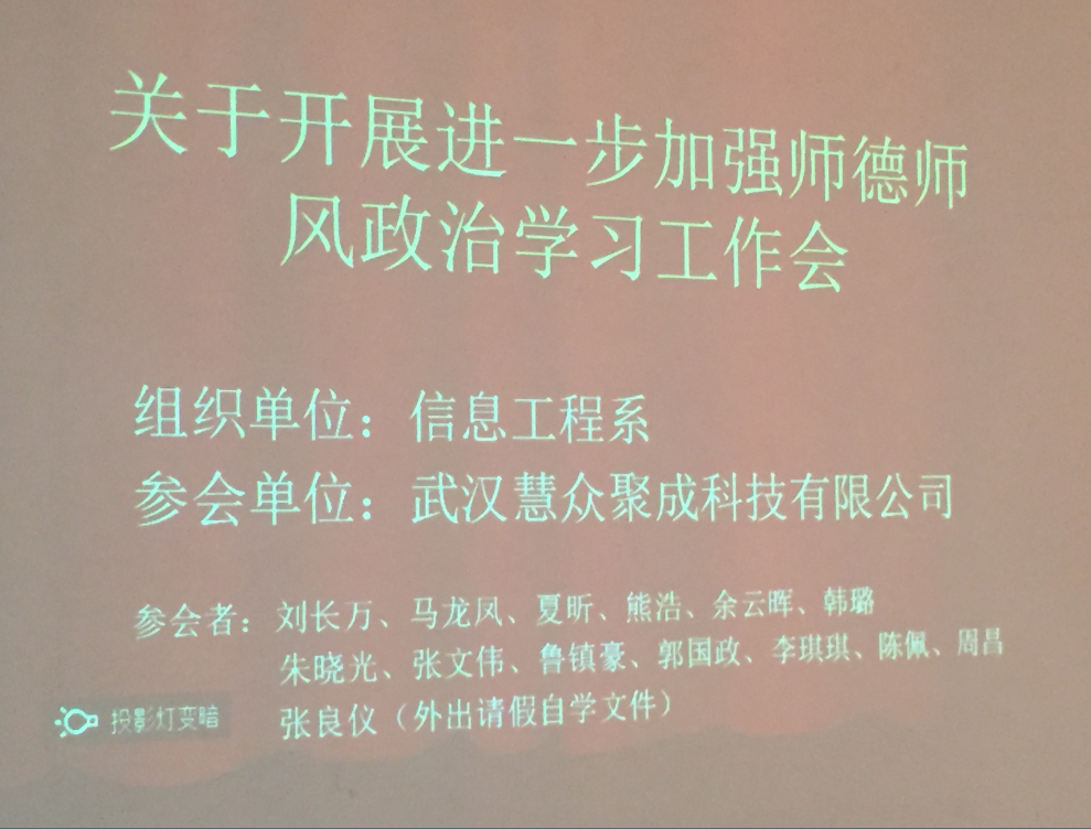 为准确把握和落实习总书记重要讲话精神,坚持一面旗帜管总,坚持社会主义办学方向,坚持传播马克思主义科学理论,坚持培育和弘扬社会主义核心价值观,坚持促进高校和谐稳定发展。信息工程系于9月15日中午在二专315办公室组织合作办学武汉慧众聚成科技有限公司的教师们开展进一步加强师德师风政治学习工作,会议由刘长万主任主持。