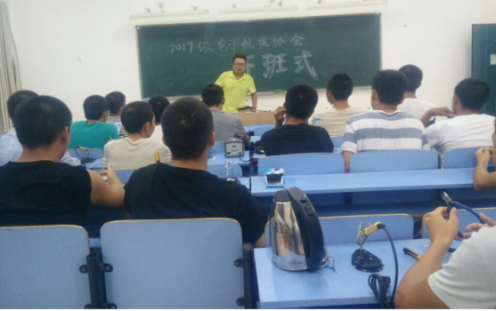 今天新生开课的第四天机电工程系电子航模协会正式开班啦!晚上七点整在协会新负责人黄威等人前期充分准备下,先完成工具发放,后学习协会规章制度,再介绍主要负责人及分工,最后请指导教师刘耀元讲话并作第一次授课。