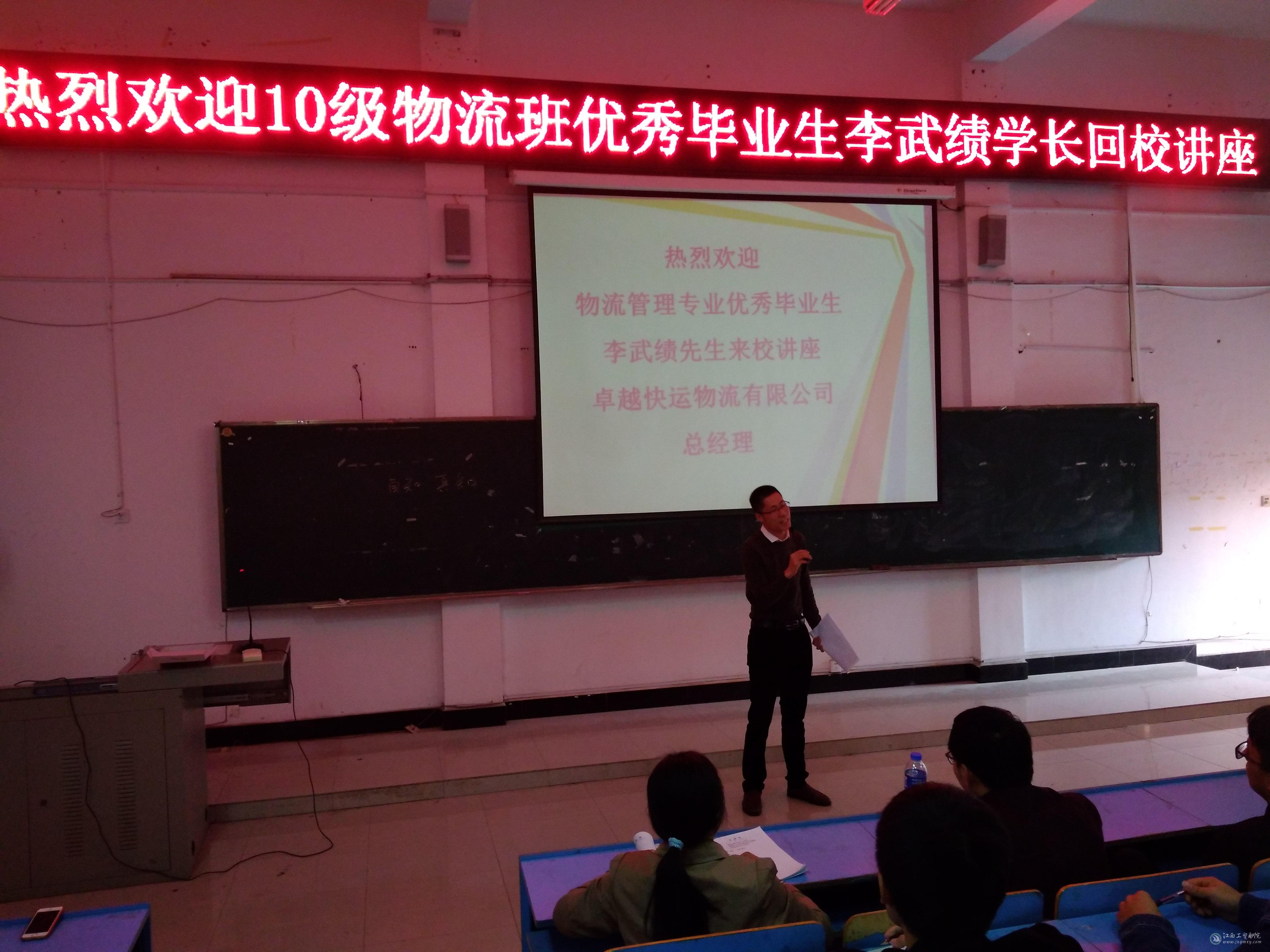 本次邀请来校开展讲座的是10级物流管理专业优秀毕业生代表李武绩,李武绩先生现任卓越快运物流有限公司总经理。李总表示非常愿意作为优秀毕业生代表回母校开展讲座,此次讲座主要是向物流管理专业的学弟学妹们介绍物流行业发展前景并与之分享自己的创业经验。李总通过分享自己毕业五年来的工作经历和成长经历,告诉大家选择在物流行业就业确实很辛苦,因为万事开头难,但只要不断努力与坚持就能让自己的人生充满无限的可能。随后在自由提问环节,李总详细回答了大家关心的创业及就业问题,并留下了自己的联系方式以便日后交流。通过此次讲座,物流专业的学生们对即将走上就业岗位充满了信心。