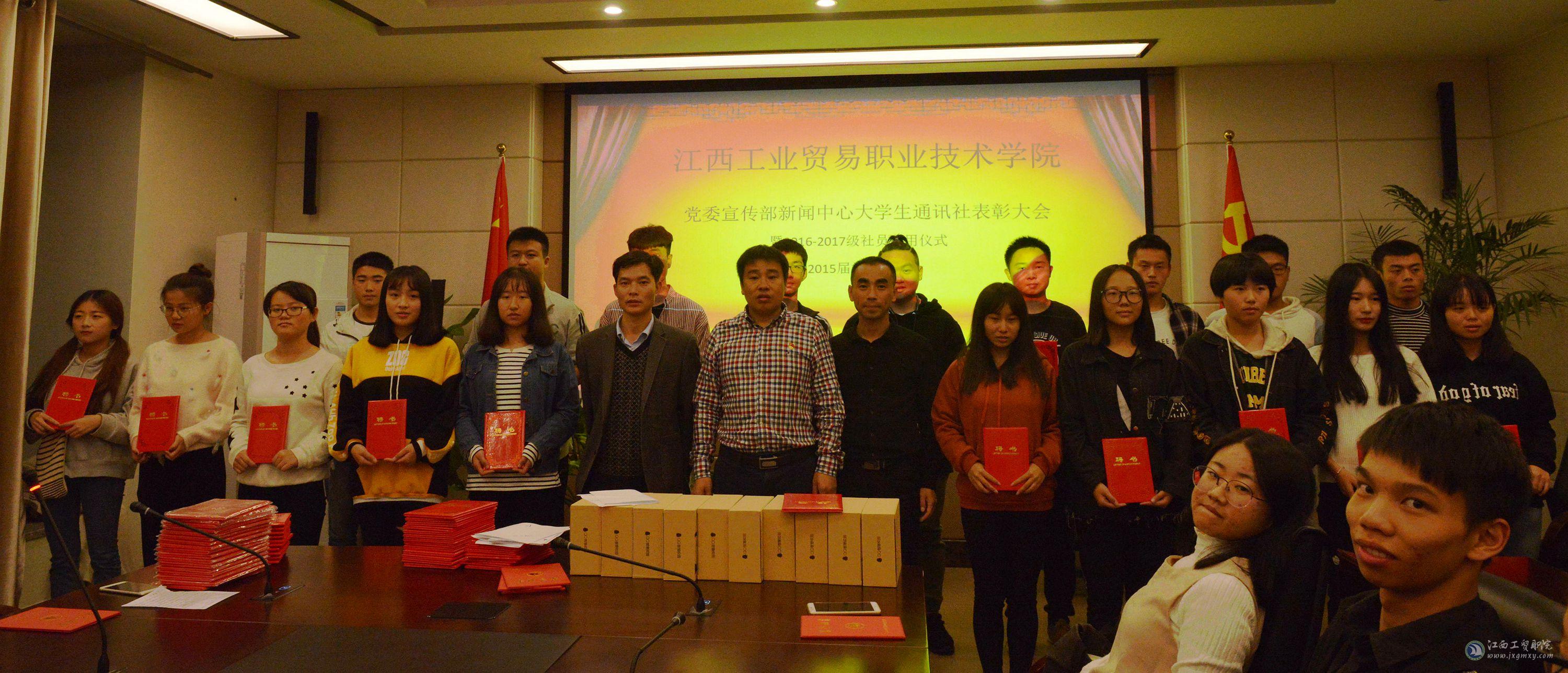 11月9日19:00,学院党委宣传部新闻中心大学生通讯社表彰大会暨2016-2017级社员聘用仪式、2015级社员欢送大会在行政楼415召开。党委宣传部部长宋小兵、党委宣传部袁孟辉、陈新文老师及学院党委宣传部新闻中心大学生通讯社全体成员出席了大会。
