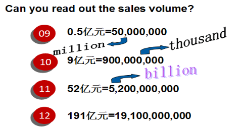 之后,师生一起分享阿里巴巴这十年来双十一的销量,并一起学习该如何用英文快速表达并理解大额数字。通过这种形象且生动的讲解和练习,学生们发现原来无法用英文表述的大数字其实是非常有规律可寻的表达。