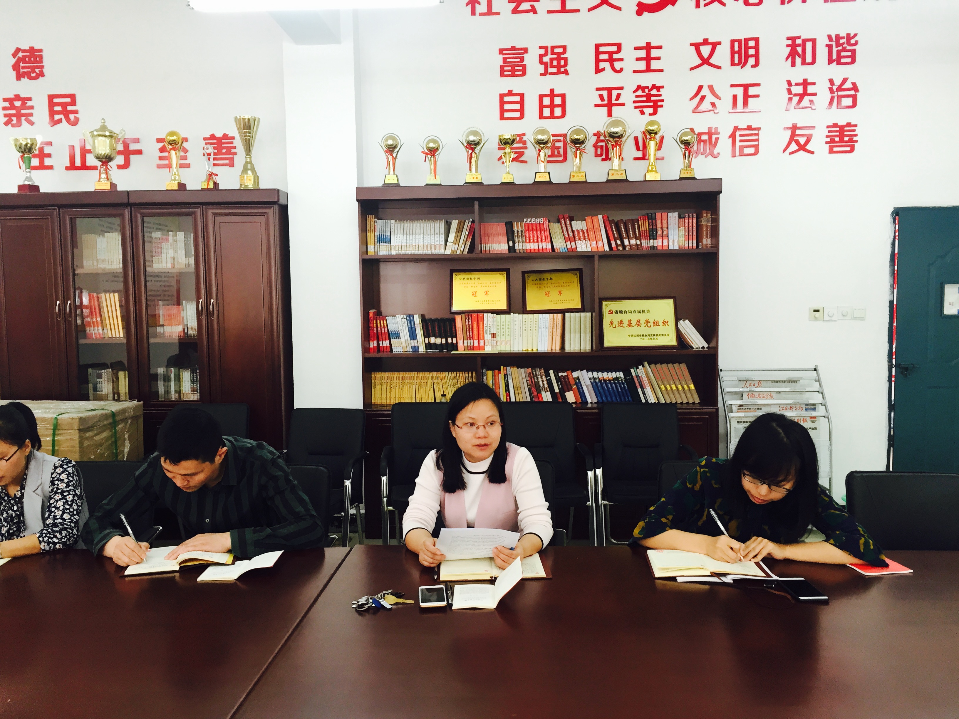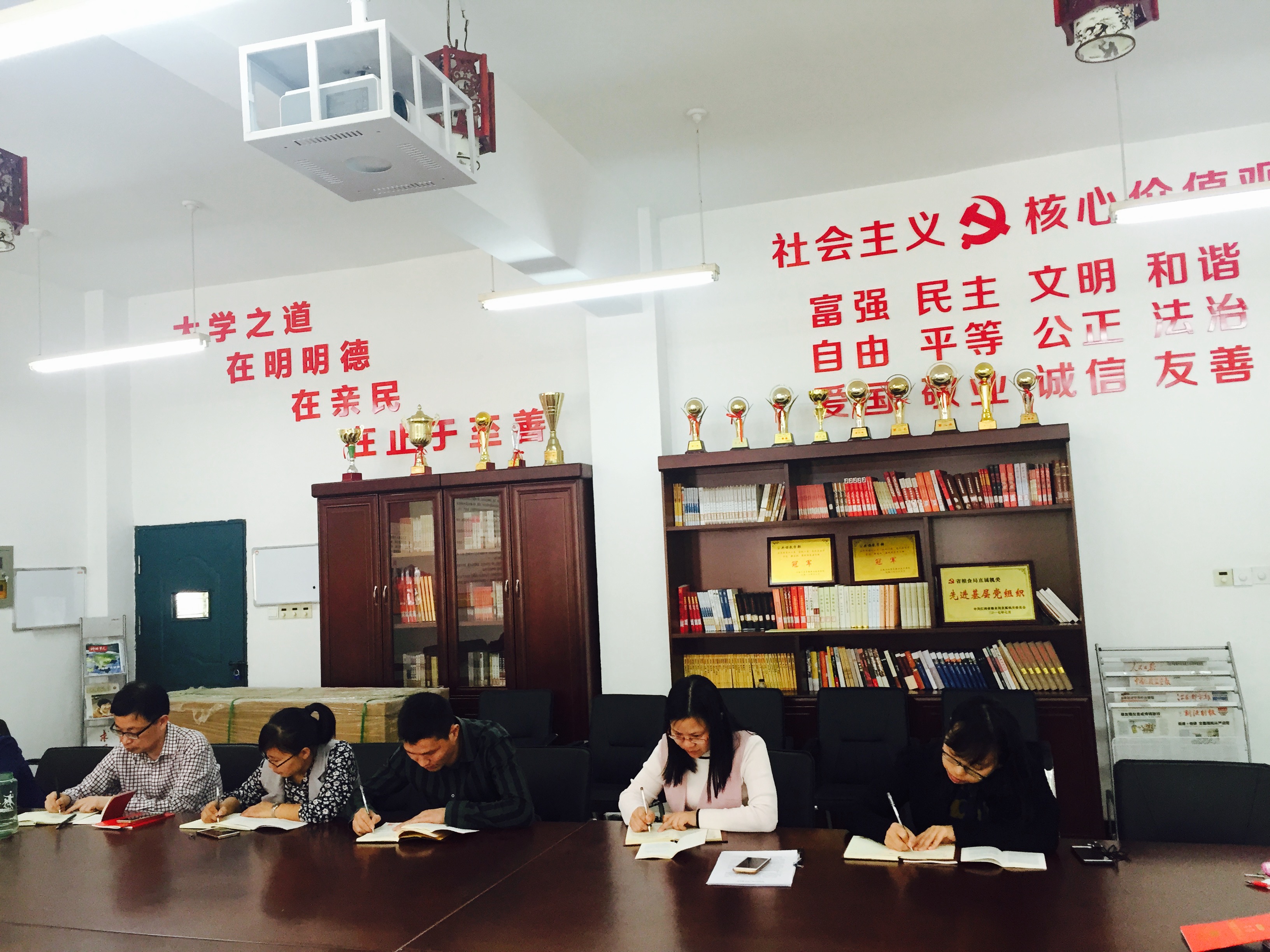 紧接着,支部全体党员和入党积极分子回到思泽楼书香党支部,支部书记黄凤芝带领全体党员和入党积极分子学习了《坚守共产党人的价值追求》、《始终把党的政治建设摆在首位》和《政治生态的“七看”“七着力”》等文章,同时,她结合学习的内容和支部党员教师的工作实际情况,对支部全体党员和入党积极分子提出了明确要求:一是支部每一位党员就是一面鲜红的旗帜,在日常教育教学活动中要“不忘初心使命,争当红烛先锋”,切实发挥党员示范岗的模范先锋作用;二是做为教师党员要时刻守住底线,要把学生当自己的孩子一样来教育、引导。