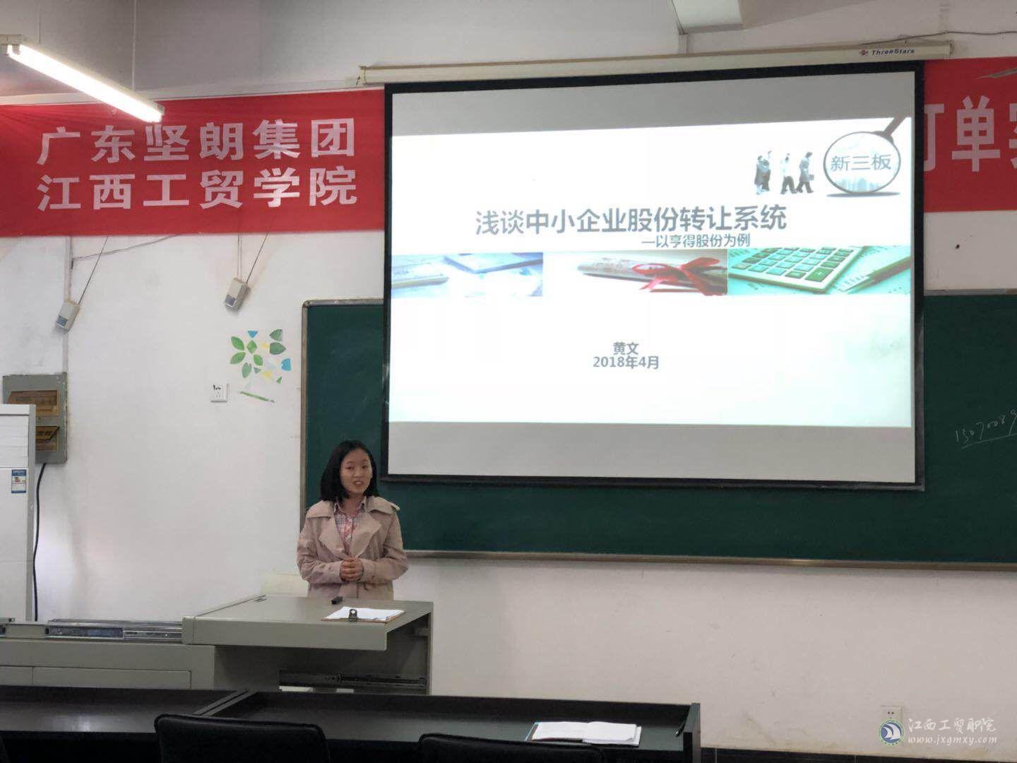 为了解探析“新三板”的基本内容和在“新三板”挂牌对中小企业的意义,经济贸易系黄文老师于2018年4月10日下午15:00—16:00在芳泽楼405教室,主讲了题为“新三板对中小企业的意义——以亨得股份为例”的公开课汇报。经济贸易系副主任陶晓峰教授、会计教研室主任胡越君、会计教研室全体教师到场听取汇报。
