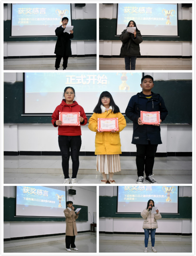闭幕式共四项议程。第一项议程是21日习惯养成之星优秀代表发言,他们分享了此次活动的收获与感悟;第二项议程由心理协会21日各组负责人对此次活动进行了小结;第三项议程为心理咨询中心教师代表高老师发表讲话,他表达了对同学们坚持的肯定,并对整个活动进行了全面总结。第四项议程是颁奖仪式,高老师亲自为21日习惯养成之星们颁发了“21日之星”荣誉证书。