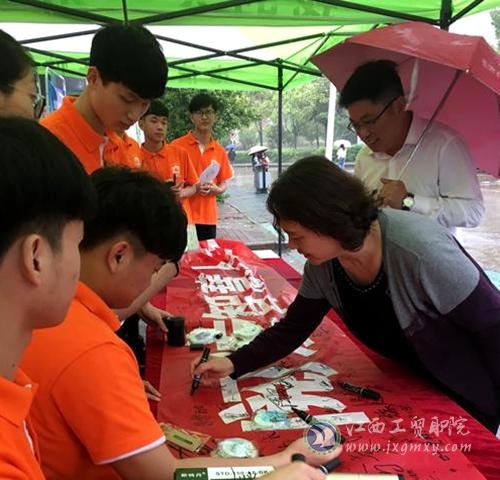 学院院长雷筱芬、副院长周晓邑等院领导和老师们,冒雨前来参加活动,在签名条幅上留言签名,送出了对广大读者的阅读寄语,在热门图书前停留,了解受读者欢迎的图书。