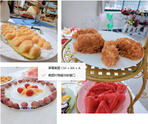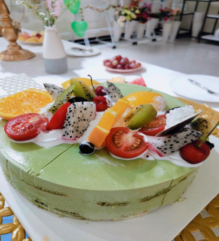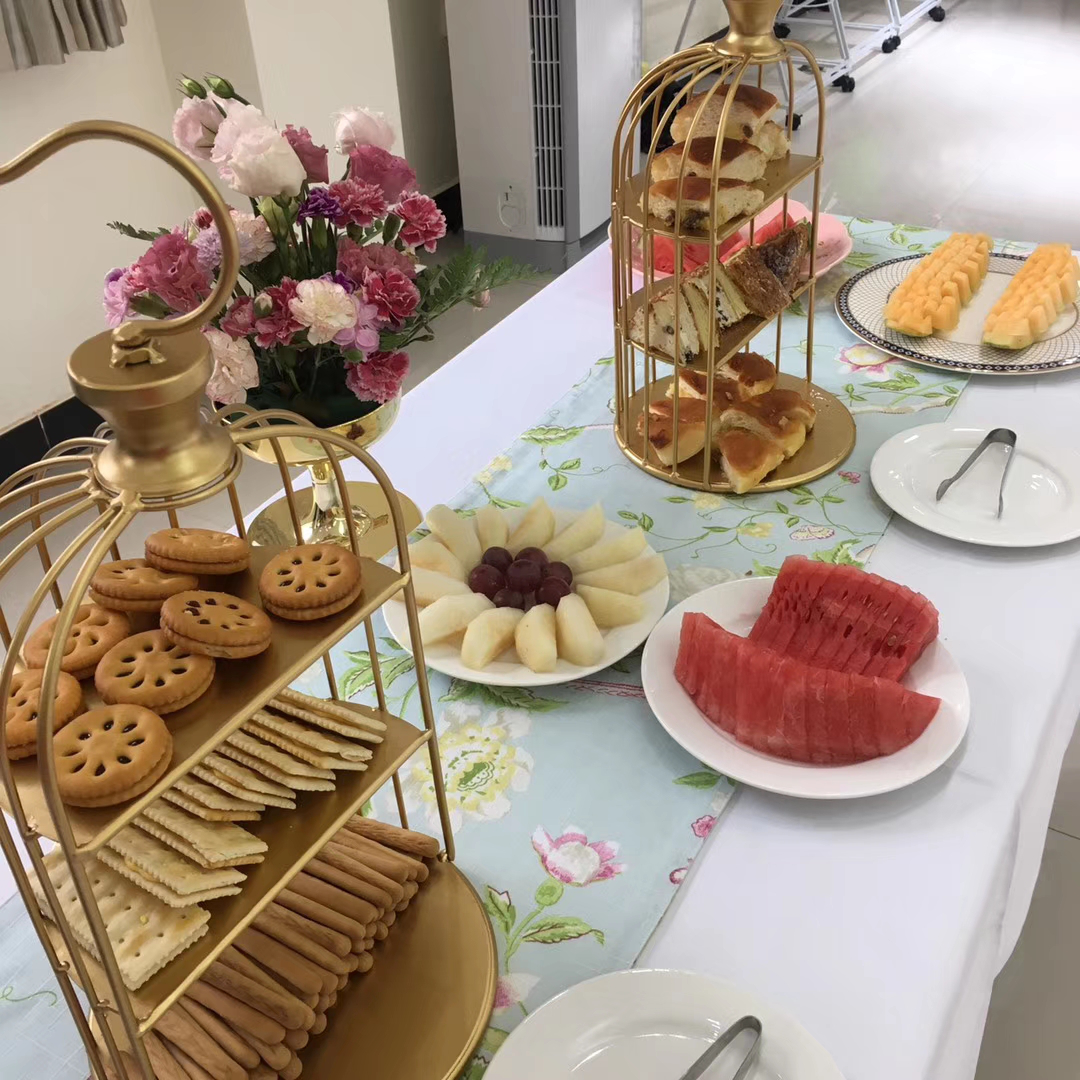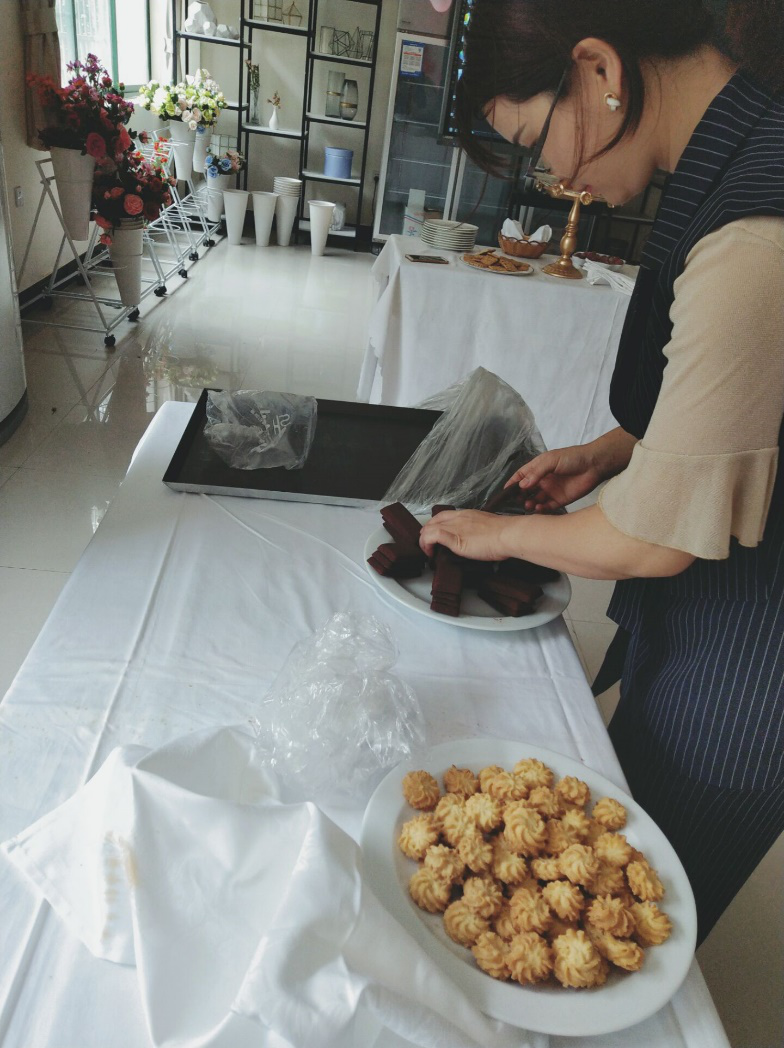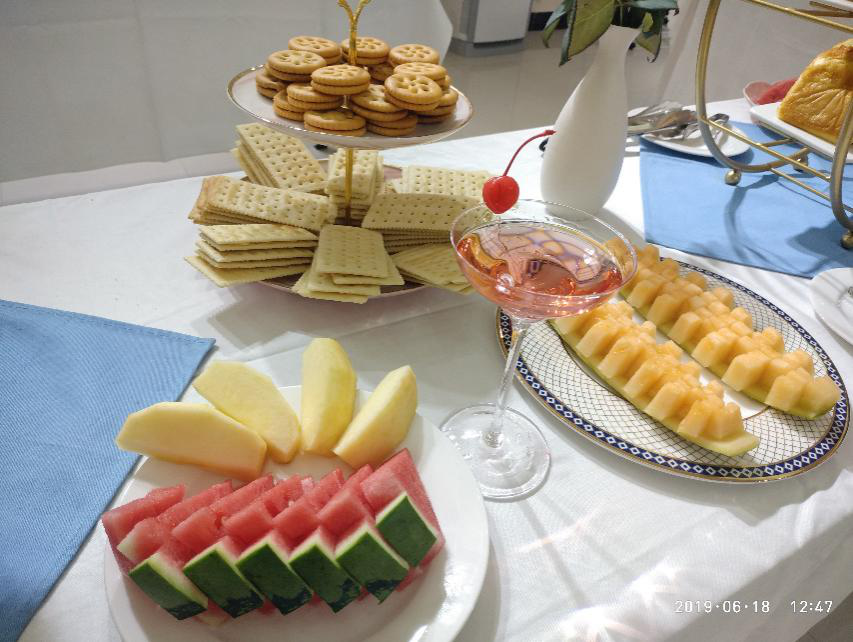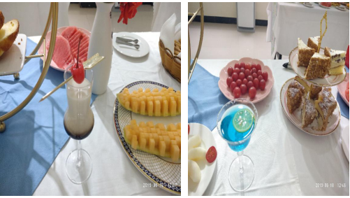 活动现场不仅有抹茶式的蛋糕,有可口的曲奇饼,和让人垂涎欲滴肉松小蛋糕等,还有造型精美的水果拼盘。这些都是西餐工艺的小哥哥小姐姐带来的,不仅美味丰盛,而且极具观赏性,让大家食欲大增。