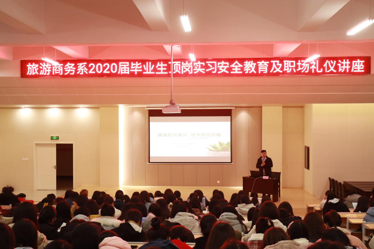 为了让毕业生们能够安全顺利的通过顶岗实习,旅游商务系于2019年12月23日晚上7点,在志学楼504开展“2020届毕业生顶岗实习安全教育及职场礼仪讲座”。出席此次讲座的有学院安全保卫处处长郑海林,旅游商务系副主任韩莹。参加此次讲座的有2020届全体毕业生。