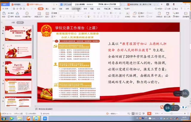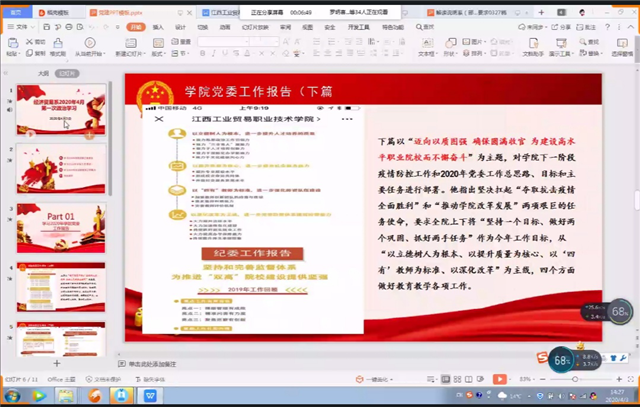 学习伊始,物流管理教研室黎华老师、邓新红老师先后领学了党委书记万玉青同志《教育报国守初心 立德树人担使命 办好人民满意的职业教育——江西工贸学院2020年党委工作报告(上篇)》和《迈向以质图强 确保圆满收官 为建设高水平职业院校而不懈奋斗——江西工贸学院2020年党委工作报告(下篇)》的主要内容。全体教职工们跟随报告一起回顾了2019年学院各项工作情况及存在的问题,同时,也对学院下一阶段疫情防控工作和2020年党委工作总思路、目标和主要任务有了清晰的认识,为后续工作指明了方向。