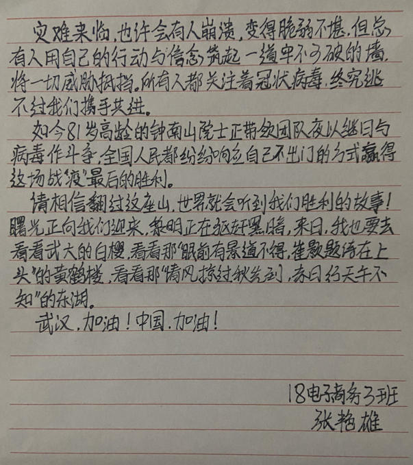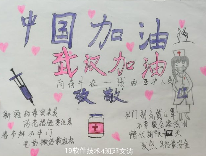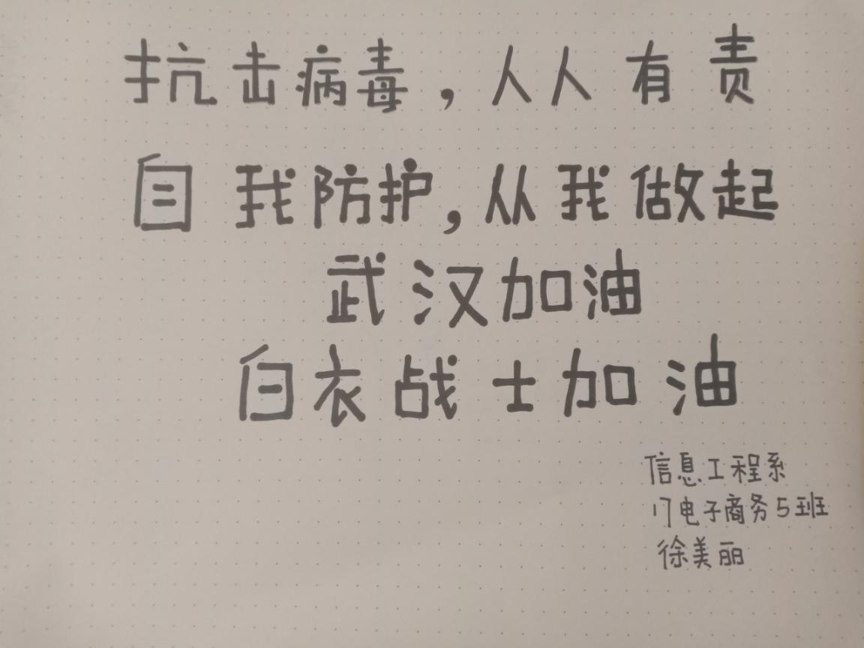 新型冠状病毒感染的肺炎疫情发展举国关注,牵动着每一个人的心。40天来,我院以党建引领有力推进疫情防控工作,广大师生党员认真学习习近平总书记关于疫情防控工作的重要讲话和重要指示精神,落实院党委的决策和部署,信息工程系全体师生在疫情面前,团结一心,众志成城,争做表率,为武汉加油,为祖国加油,齐心协力为疫情防控做出积极的贡献。