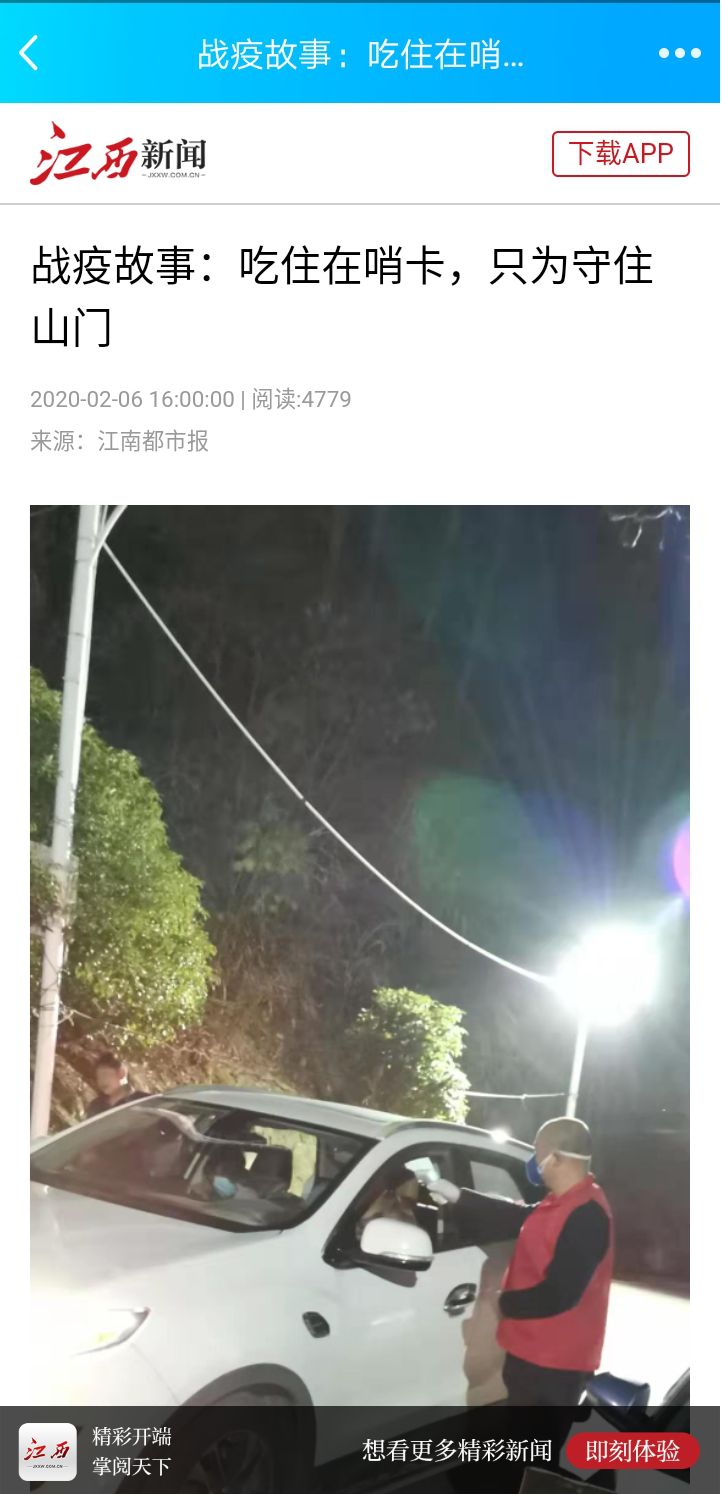 而在江西工贸学院旅游商务系的学生家长中,也有这样一位英雄。19城轨2班程志豪的爸爸程光生在南昌市湾里区卫东村村委会工作。自2020年1月26日,南昌市湾里区洗药湖管理处卫东村在忠庄自然村路口设立了哨卡后,程光生充分发挥党员模范先锋作用,每天吃住在哨卡,只为守护一方平安。