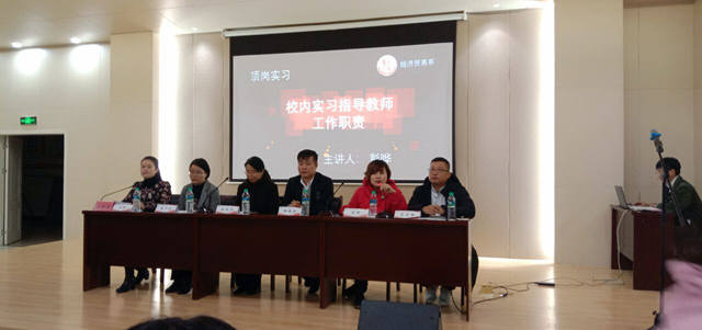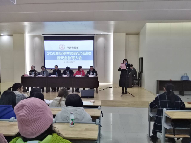 为切实做好经济贸易系2020届毕业生顶岗实习双选工作,帮助学生了解当下大学生实习与就业形势,掌握学院顶岗实习相关管理制度,树立科学实习就业观念,经济贸易系于2019年11月27日晚18点40分在志学楼504召开了2020届毕业生顶岗实习动员暨安全教育大会。学院党委委员•副院长赵淑华、南昌金源财务咨询管理有限公司总经理熊宁苓、保卫处处长郑海林、经济贸易系彭晔主任、经济贸易系副主任范东辉作为领导嘉宾出席了会议,另出席大会的还有各教研室主任、2020届毕业班辅导员和全体2020届毕业生。大会由经济贸易系副主任何静主持。