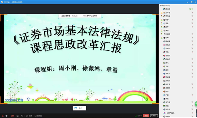 本次经验交流分享会上,首先由会计专业教研室周小刚老师针对《证券市场基本法律法规》这门课程,从课程思政改革的目的和意义、专业知识与思政教育知识点的融合、该门课程当前进行思政改革情况及思考等四个方面进行了经验分享与交流。周小刚老师强调,希望以这次课程思政改革为契机,教学团队继续探讨教学素材的挖掘,知识点的融入技巧和手段,坚持立德树人为根本任务,努力培养学生在今后从事投资活动岗位实践中,坚持以社会主义价值观为核心内容,培养学生树立正确的世界观、人生观、价值观,树立依法治国的理念。