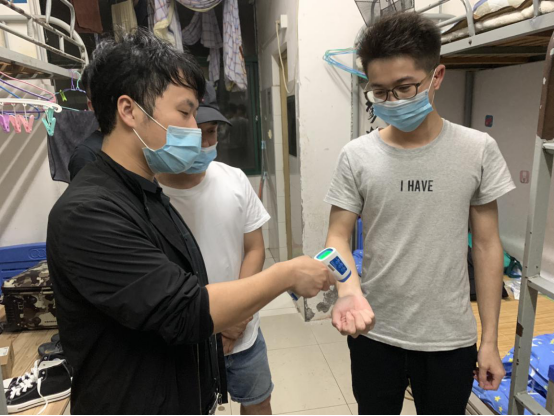 为贯彻落实学院关于疫情防控的要求,对学生进行晨午晚三检,教学管理员陈弘锋、行政值班徐劲老师、当天值班辅导员毛婧等党员教师,于学生返校25日晚21:30分,对返校学生逐个测量体温,并对学生宿舍进行一系列的消杀措施,让返校学生的生活起居有所保障,住的安心。