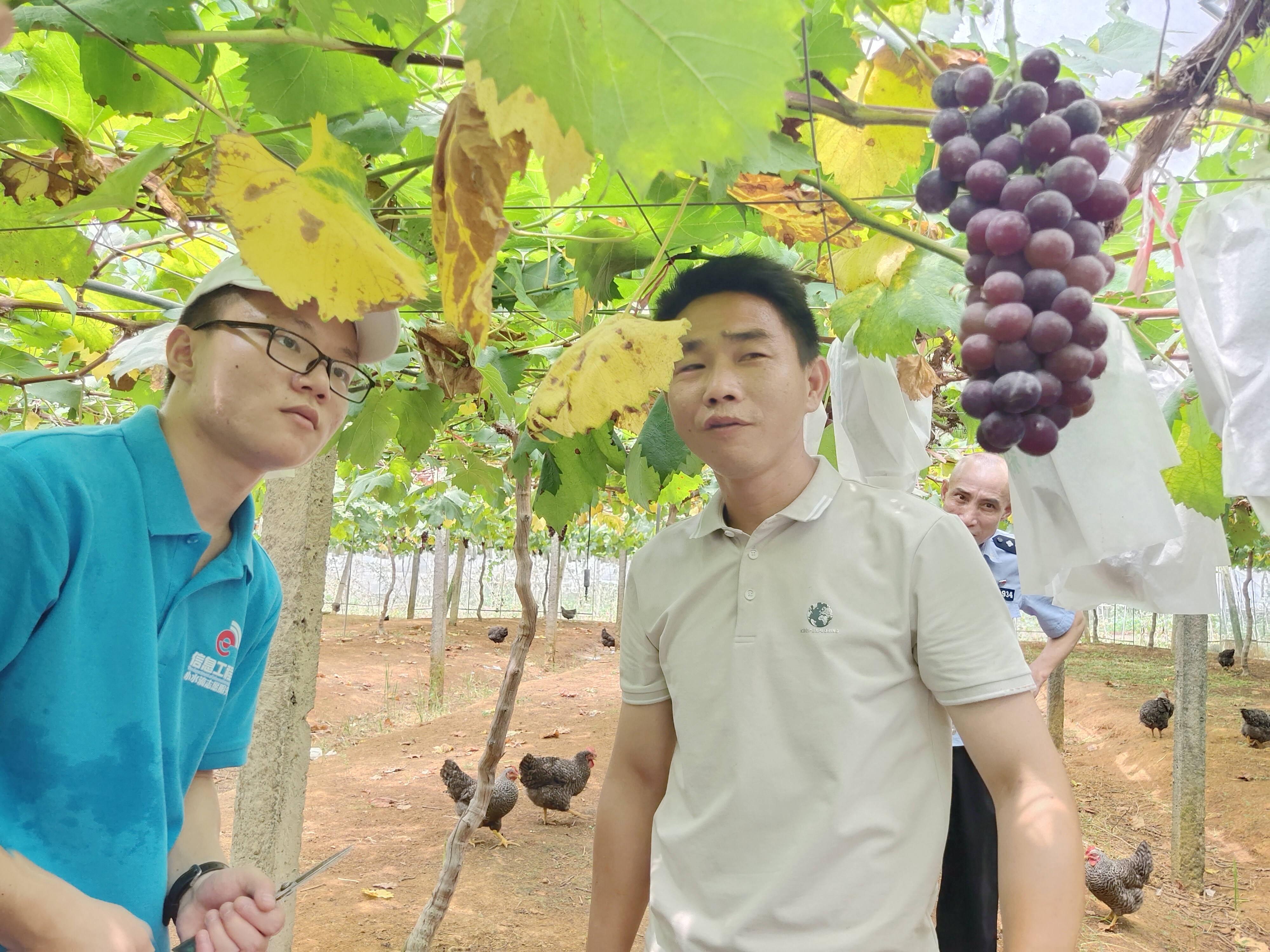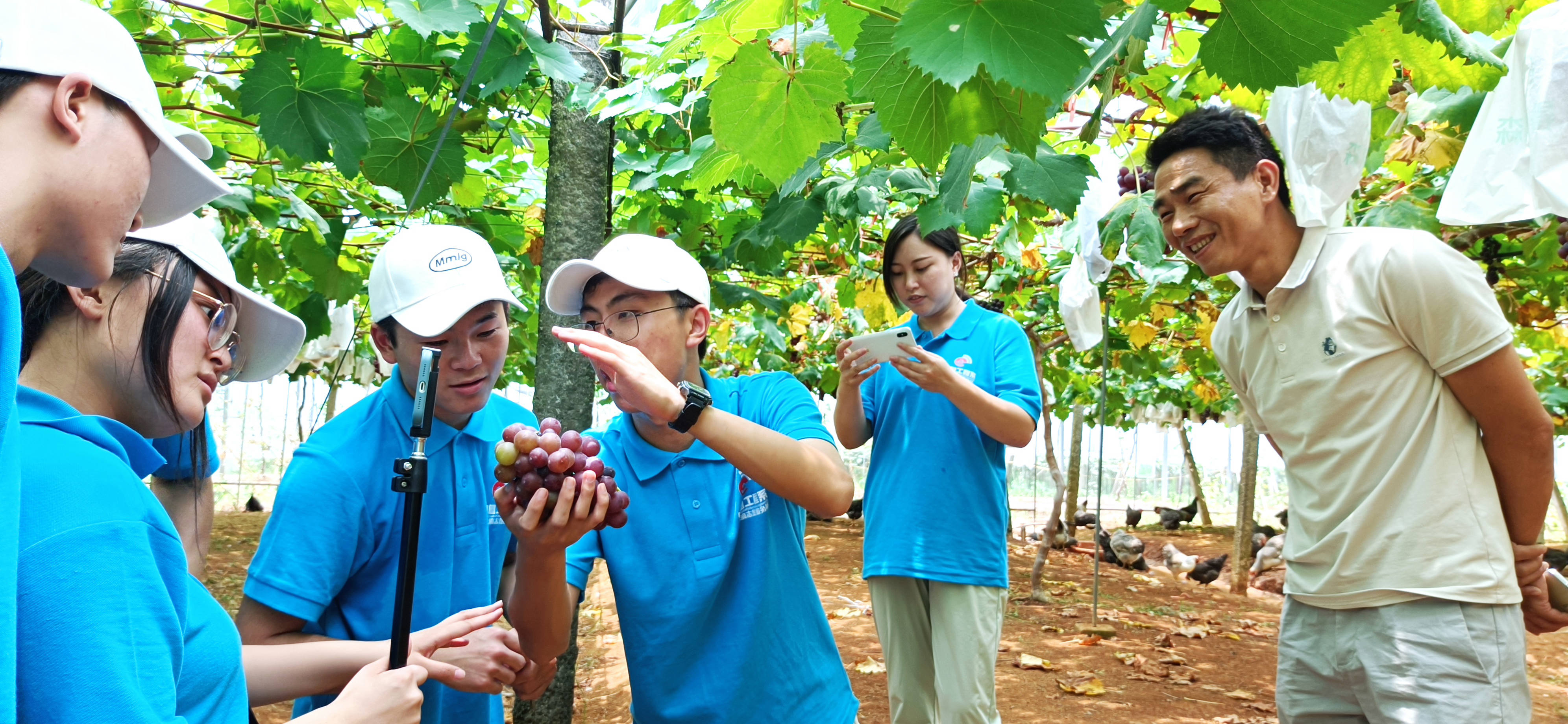 为引导广大青年学生在社会课堂中受教育、长才干、作贡献,第三天,7月28日,实践队在湖陂村干部的帮助联络下,实地调研当地葡萄园种植基地,帮助果农打理果园,并以抖音直播的形式,助力乡村振兴。