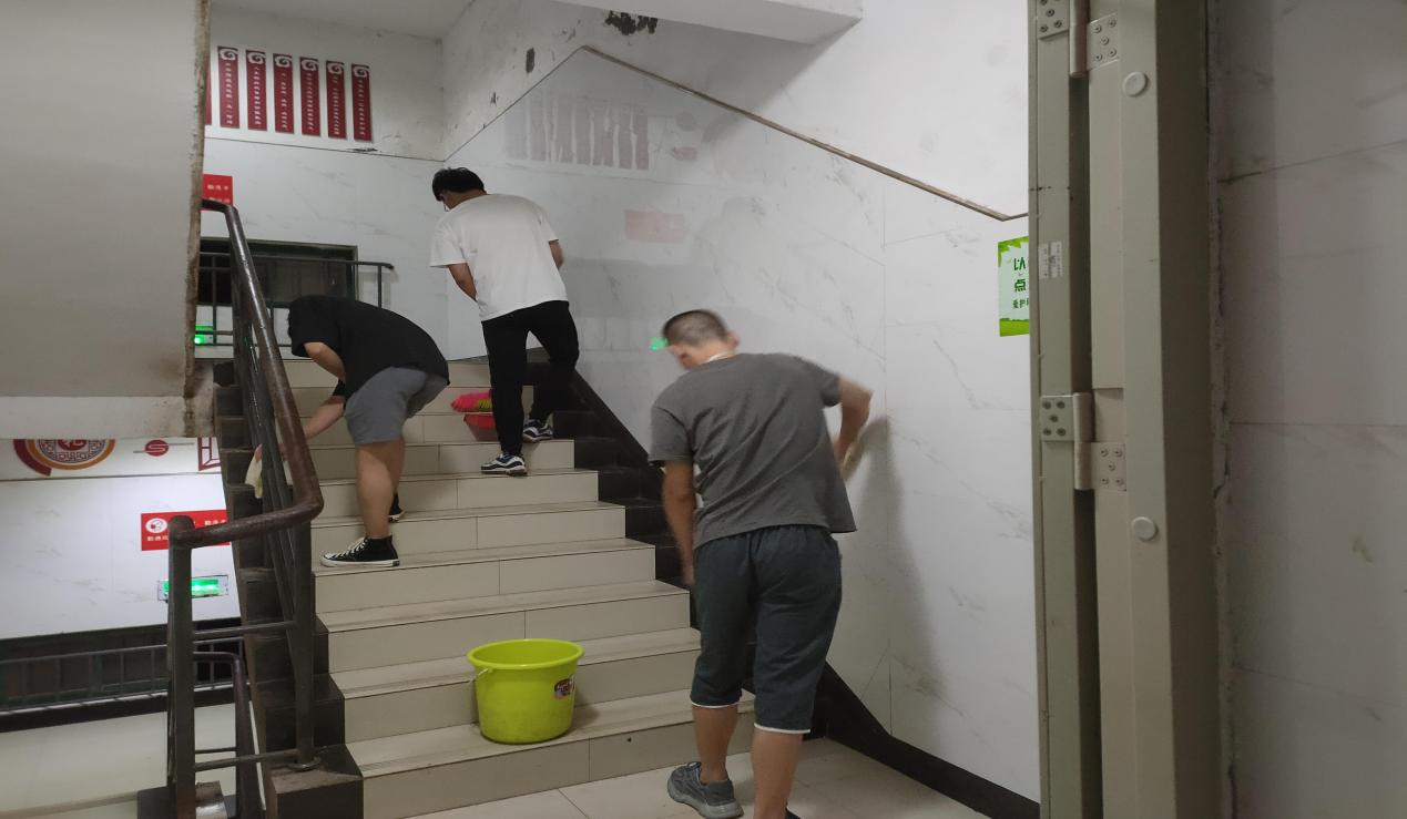 整个清洁过程中,同学们积极响应,各司其职。有的负责接水、拎水,有的负责扫地和清洁抹布,同学们想尽一切方法将藏匿在楼梯口、楼道门和扶手中顽固的污渍清理干净,即使是细小的灰尘也不放过。经过一个晚上的反复清洁、内外擦拭,寝室楼栋焕然一新。
