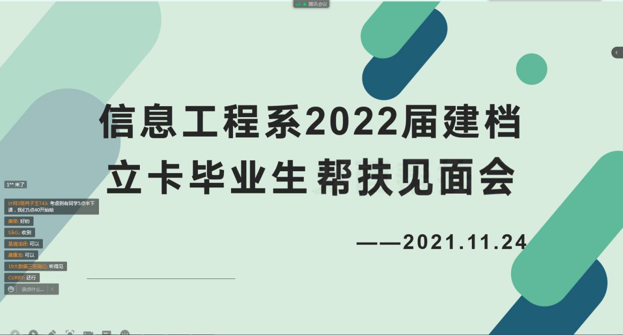 为贯彻落实高校毕业生就业工作有关要求,了解建档立卡户毕业生在顶岗实习前的思想状态,信息工程系于2021年11月24日下午5:30在线上召开2022届建档立卡户毕业生帮扶见面会。全体毕业班辅导员及2022届全体建档立卡户毕业生参加会议,系就业创业干事梅越老师主持。