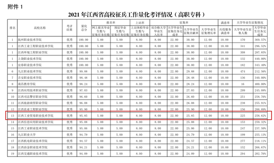 近日,江西省人民政府征兵办公室、江西省教育厅联合印发《2021年江西省普通高等院校征兵工作量化考评情况通报》,学院以七个指标满分、总成绩95.85分,在全省高校征兵工作量化考评中名列前茅,被评为“优秀”等次。