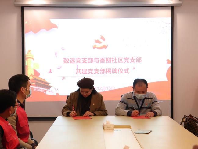 第二阶段,座谈结束后,致远党支部副书记黄婧与红谷滩区红角洲管理处香榭社区党支部站长胡绪同现场签署“结对共建”协议并启动揭牌仪式。
