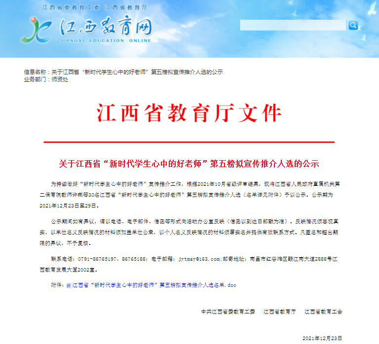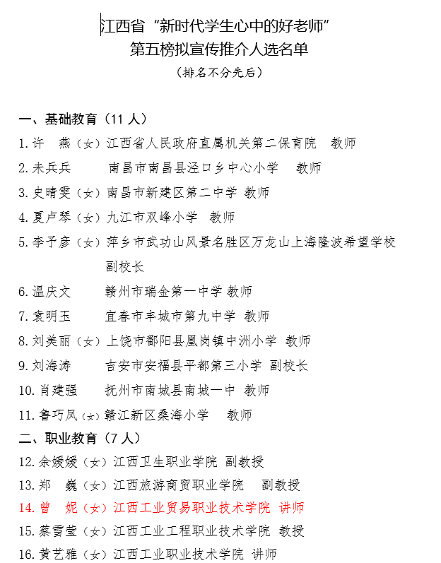 经学院推荐、省级评审和公示,中共江西省委教育工委、江西省教育厅、江西省教育工会日前公布了江西省“新时代学生心中的好老师”第五榜宣传推介人选,江西工业贸易职业技术学院教师曾妮光荣上榜。曾妮以实际行动践行了习近平总书记有理想信念、有道德情操、有扎实学识、有仁爱之心的“四有”好老师标准,以自己的真情、真心、真挚和真诚,默默地诠释着一位高职教师的“工匠精神”,成为了新时代学生心中的好老师。