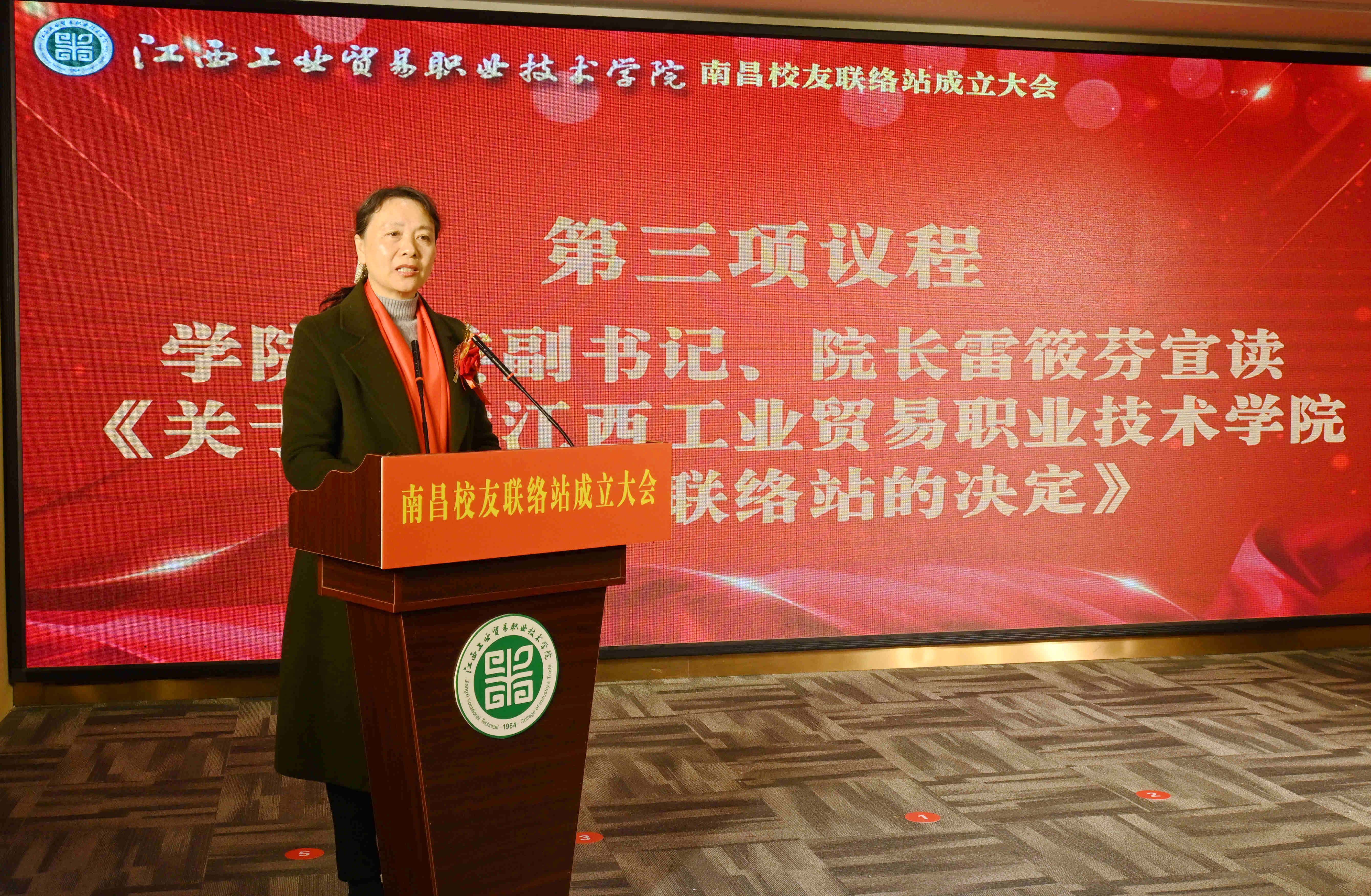 会上,雷筱芬宣读《关于成立江西工业贸易职业技术学院南昌校友联络站的决定》。她指出,校友工作是学院一项长期的战略性工作,校友是学院的宝贵资源。长期以来,学院高度重视校友工作,不断推动校友联络、建立校友组织、开展校友活动和增进校友合作。希望南昌校友联络站认真听取校友意见,广泛团结校友力量,切实服务广大校友,充分发挥温暖校友的传情作用,共谋发展的智囊作用,回馈母校的协调作用。与母校同心协力,推进母校与校友在感情和事业上的密切联系、有力互动,促进校友和母校事业共同发展。为推进江西高质量跨越式发展,携手书写全面建设社会主义现代化江西的精彩华章作出更大贡献!