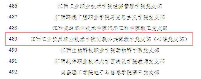 近日,教育部公布《第三批新时代高校党建示范创建和质量创优工作》遴选结果。江西工贸职院书香党支部入选“全国党建工作样板支部”培育创建单位。此次遴选共产生了11个全国党建工作示范高校、100个全国党建工作标杆院系、1000个全国党建工作样板支部。江西省共有25个高校支部入选全国党建工作样板支部,其中高职院校共有5个支部入选。