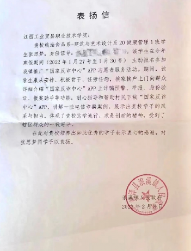 我在今年寒假期间(2022年1月27号至1月30号)主动报名参加我镇推广“国家反诈中心”APP志愿者服务活动。志愿期间,我服从安排、积极肯干、任劳任怨,挨家挨户上门向群众详细介绍“国家反诈中心”APP上诈骗预警、举报、身份验证、报案助手等功能,耐心指导和帮助村民下载“国家反诈中心”APP,讲解一些电信诈骗案例。展示出粮建学子的风采与担当,体现了学校明德敏行、技高志远的精神,受到了辖区群众的一致好评。