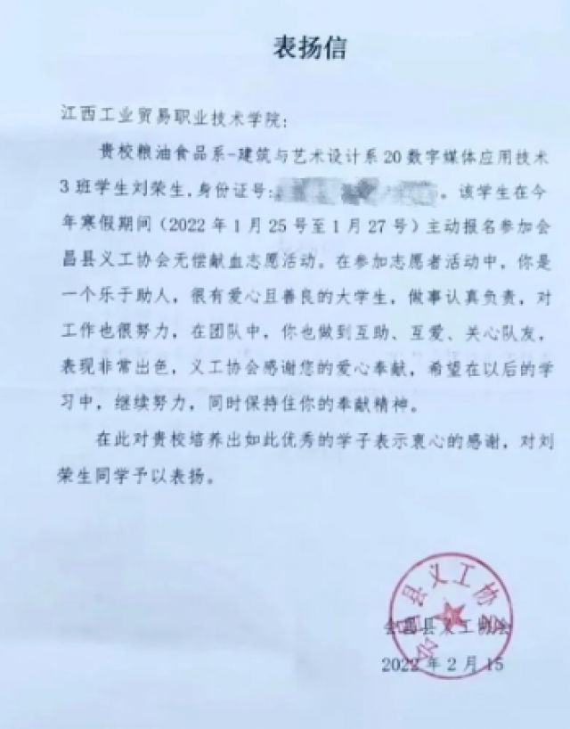 他是赣州市会昌县2022年春节青年志愿者的一员,现就读20数媒3班,他的名字是刘荣生,所在的服务点是赣州市会昌县文化广场献血车当志愿者。