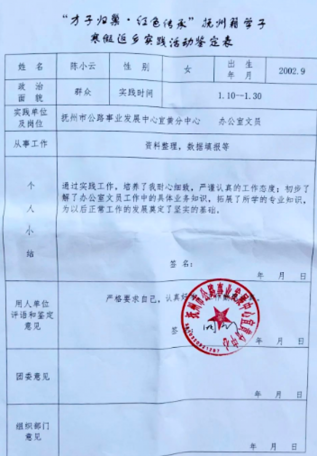她是抚州市2022年春节青年志愿者的一员,现就读21健康管理班,她的名字是陈小云,所在的服务点是抚州市公路事业发展中心宜黄分中心,后分配到办公室文员工作。