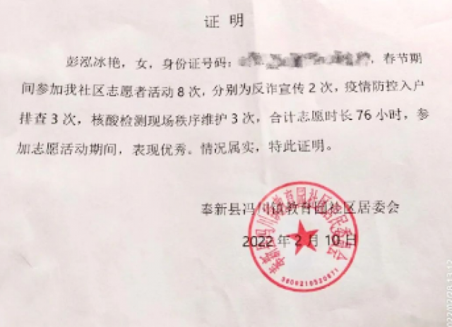 她是奉新县2022年春节青年志愿者的一员,现就读21建筑室内设计3班,她的名字是彭泓冰艳,所在的服务点是奉新县冯川镇教育园社区居委会,后分配到反诈宣传、核酸检测现场秩序维护、疫情防控入户工作。