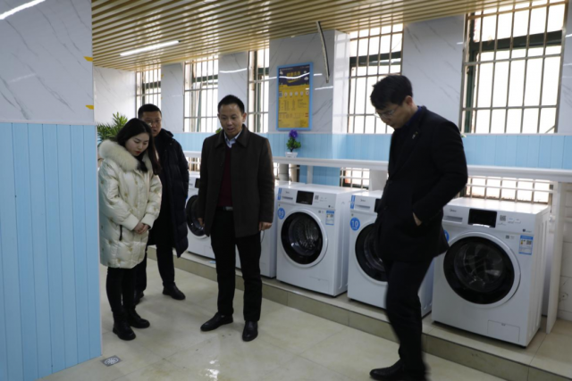 在检查工作开始之前,学院党委委员、副院长刘国红特别关注了学生们的生活区域,新型自助洗衣房。这为同学们的日常生活带来的是前所未有的便捷,通过洗衣APP或微信公众号实现了在线预约、下单、查看洗衣进度、完成提醒、网络支付等服务,实现了——“遥控洗衣”;同时,自助洗衣机还自带了桶自洁和银离子杀菌功能,特别是除菌率99.99%的纳米银离子除菌技术,为学生提供接近无菌的洗涤环境。