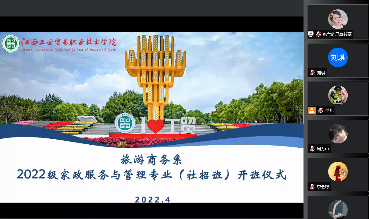 为保证社招班开学工作的顺利开展,4月14日晚上7:00,旅游商务系通过腾讯会议召开了2022级家政服务与管理专业(社招班)开班仪式。旅游商务系主任谢恺、副主任韩莹、商务教研室主任周万中、教学管理员王舒、班主任刘萍以及22级家政服务与管理班全体学生参加了本次会议,会议由旅游商务系副主任黄婧主持。