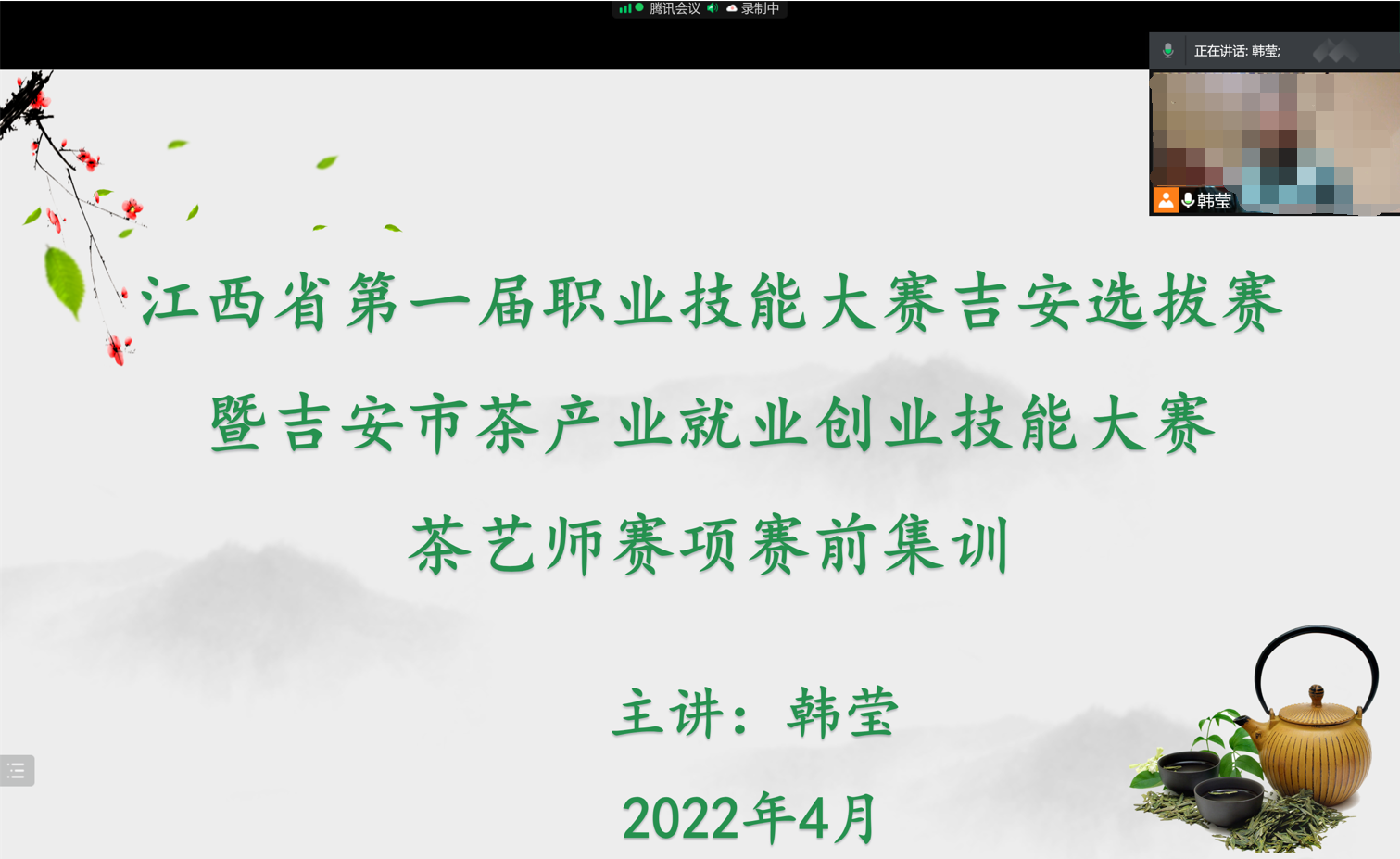 4月23日晚19:00——21:00,受遂川县人社局邀请,我校选派韩莹教师工作室负责人韩莹老师为江西省第一届职业技能大赛吉安选拔赛暨吉安市茶产业就业创业技能大赛茶艺师赛项参赛选手们进行了一场云端培训,竞赛选手二十余人通过腾讯会议参加了培训。