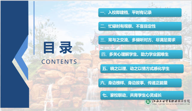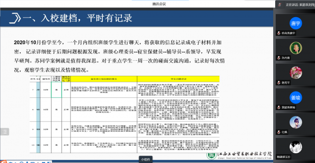 梁老师主讲后,邀请了学院抗疫一线的辅导员刘萍老师以自己的亲身经历和大家分享了自己宝贵的工作经验,她从七个方面向大家诠释了如何从“爱”出发,用心用情用方法做好学生心理工作。她丰富的工作经验给辅导员们带来了很大的启发。