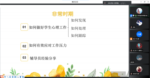 此次培训由学院心理咨询中心梁思晨老师主讲,她主要针对疫情期间,辅导员如何发现学生心理问题、如何处置学生心理问题、如何跟踪学生心理问题及如何缓解自身工作压力四方面进行了讲解,不仅给辅导员们提供了现实可行的具体工作方法,还从心理学专业角度深入浅出地给辅导员们剖析了压力的产生机制,引导老师们掌握自我调节的方法,辅导员们纷纷表示受益匪浅。