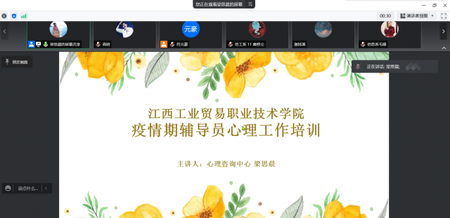 为积极贯彻落实《学院关于加强疫情期间学生心理工作的实施方案》,做好学院疫情期间学生心理健康工作,提升辅导员疫情期心理工作技能,保障校园安全稳定,4月24日晚上7时,学工处心理咨询中心利用腾讯会议组织召开了“疫情期辅导员心理工作培训”,各系心理辅导站成员及全体专兼职辅导员共计150余名教师参加。