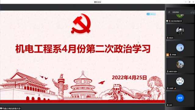 在全市上下抗“疫”期间,我系教职工全力以赴完成学院的每项疫情防控指令,师生们停课不停学,有条不紊开展线上教学的同时,作为党员同志,我们也从未停止学习的步伐,机电工程系于2022年4月25日晚7:30分在腾讯会议召开线上四月份第二次政治学习。会议由光明党支部书记、系主任马龙凤主持,机电工程系全体教职工参与此次会议。