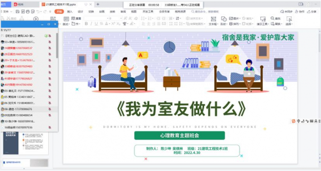 宿舍关系是大学最基本的人际关系,舍友相处的融洽程度会影响自身的心理状态和校园生活质量。当前,疫情防控处于攻坚期,由于防控政策的要求,同学们与自己的舍友几乎是24小时待在一起,彼此的接触更频繁,再加上个性特征、生活习惯等方面的差异,宿舍成员间的矛盾也更容易激发。为应对疫情给学生带来的宿舍关系的影响,促进宿舍关系融洽,建立和谐宿舍,保障宿舍安全,构建疫情当下和谐校园。粮油食品系 f 建筑与艺术设计系各班于2022年5月6日前开展了形式多样的“我为室友做什么”的主题班会活动。主题班会由各班辅导员主持,班级全体学生参与。