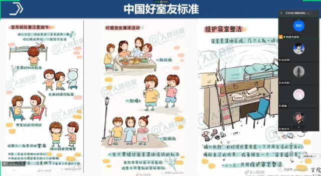 辅导员开展主题班会时,从常见的寝室内不良行为习惯为切入点,让学生自己说,教育学生换位思考,为他人着想。同时,辅导员老师们纷纷支招,教育学生在寝室关系中应学会七点:学会建立边界,学会换位思考,学会稳定情绪后沟通,学会助人和赞赏,珍惜宿舍集体活动,维护寝室整洁等。最后,辅导员告诉学生们:虽然疫情时期只能在宿舍学习,但宿舍是同学们的第二个家,同学们要努力做到如在教室一般,跟紧老师的教学计划与安排,扩充个人的知识水平和能力,争做一个优秀的工贸学子。