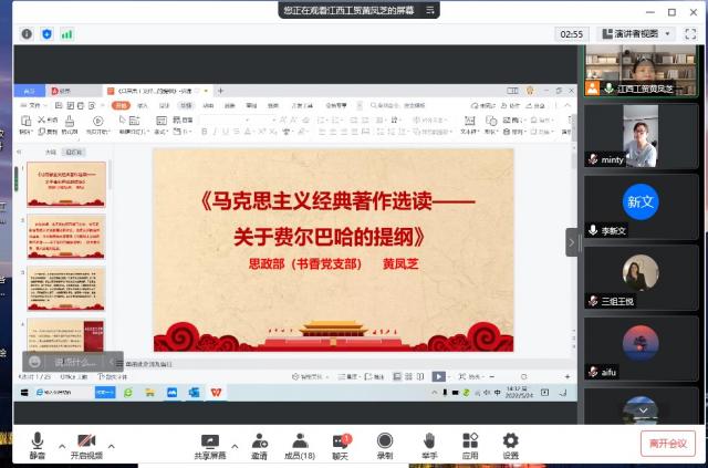 5月24日,书香党支部通过腾讯会议的方式在线上开展了党支部书记讲党课活动,支部书记黄凤芝同志通过读书分享会的形式以“马克思主义经典著作选读——关于费尔巴哈的提纲”为主题给支部成员上了一堂生动、深刻的专题党课,党支部全体党员同志参加了此次活动。