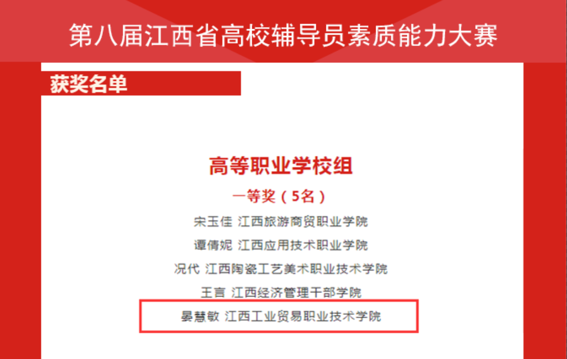 6月13日至14日,第八届江西省高校辅导员素质能力大赛在南昌举行,经过连续两天的激烈角逐,信息工程系辅导员晏慧敏老师脱颖而出,荣获第八届江西省高校辅导员素质能力大赛(高等职业学校组)一等奖的优异成绩。