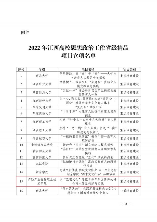 近日,江西省教育厅公布了2022年江西高校思想政治工作省级精品项目培育建设工作立项结果,经学院推荐、资格审核、专家遴选、结果公示等程序,全省共40个项目立项,其中重点培育建设项目15个。江西工业贸易职业技术学院申报的项目《以“五粮文化”厚植青少年家国情怀的特色育人体系构建与实践》获得重点培育建设立项,是全省唯一高职院校重点培育建设项目。