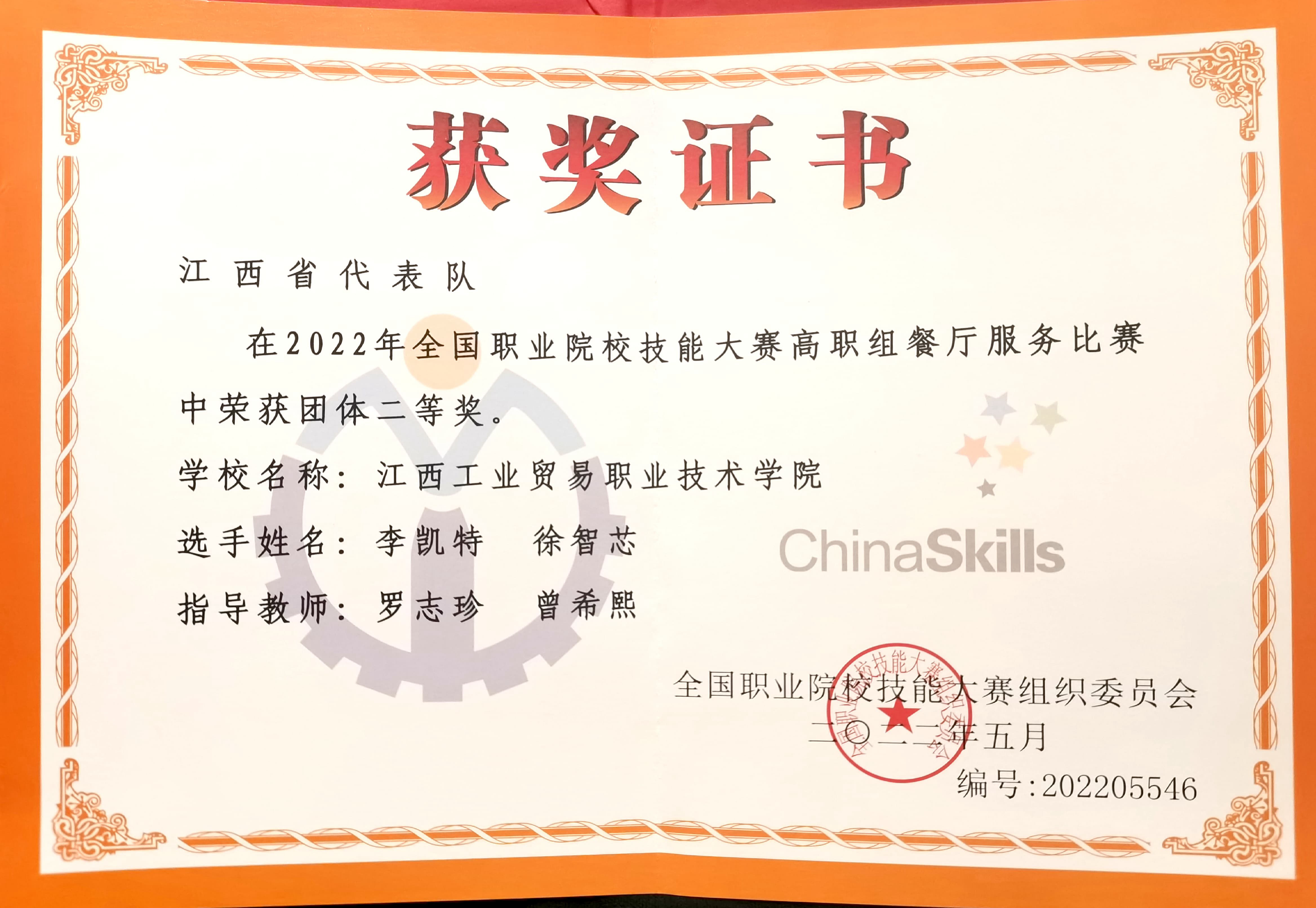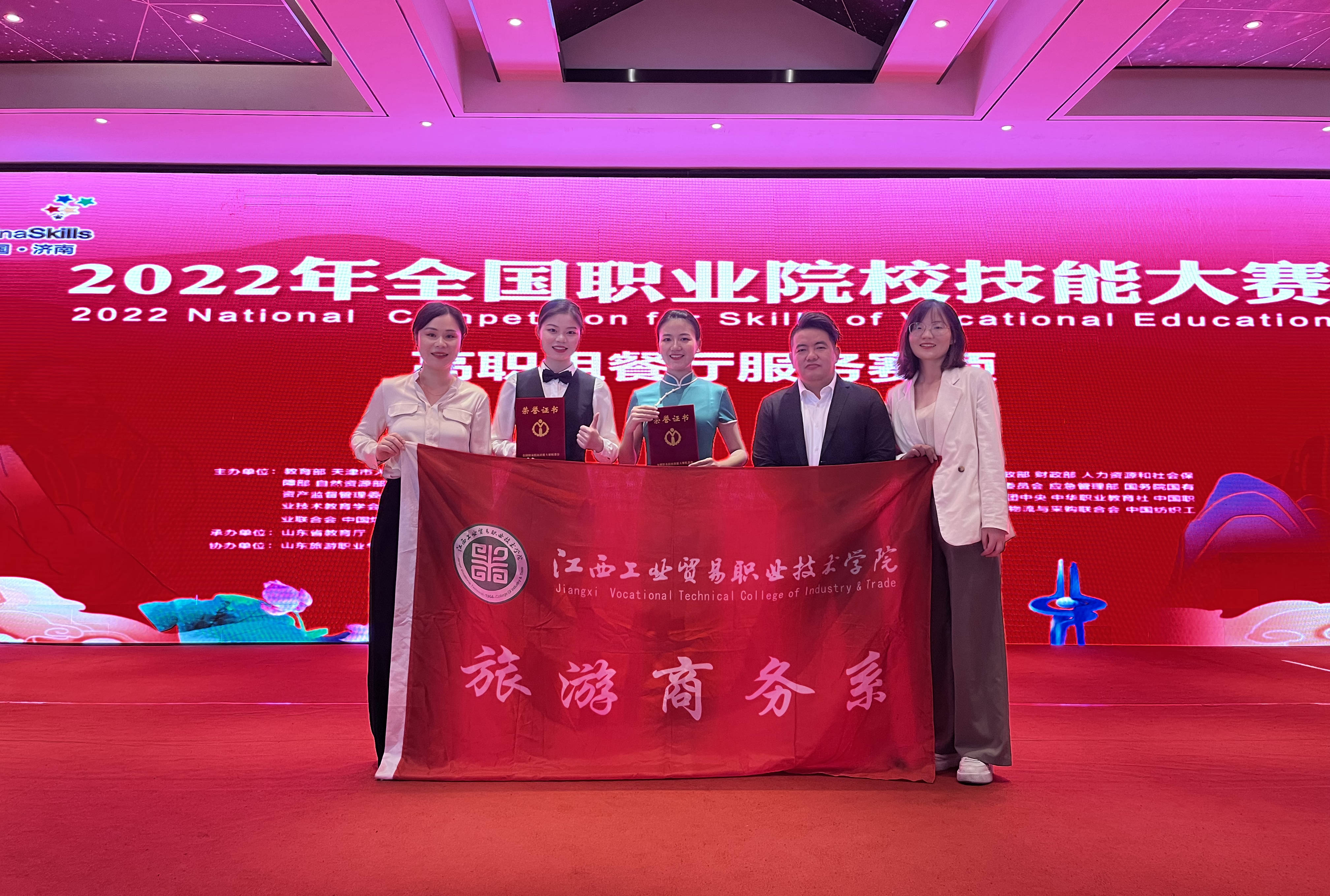 技炫青春,能创未来。8月28日至9月1日,2022年全国职业院校技能大赛高职组“餐厅服务”赛项在山东旅游职业学院顺利举行。来自全国的57支代表队共114名选手将云集赛场、尽展风采,上演一场餐厅服务技能的“巅峰对决”。经过激烈角逐,江西工业贸易职业技术学院旅游商务系李凯特、徐智芯两位同学组成的参赛团队,在罗志珍、曾希熙老师的指导下,代表江西省出战,经过奋勇拼搏,最终以全国第7名的好成绩,荣获团体二等奖,取得了学院在该项赛事上的新突破,充分彰显了学院较强的教学质量和办学实力。