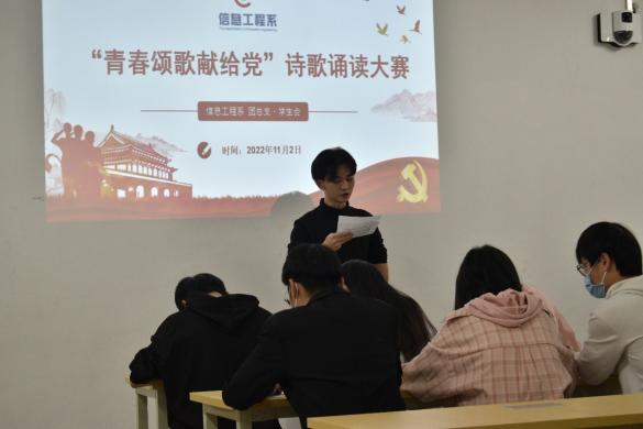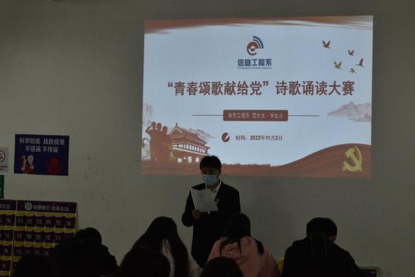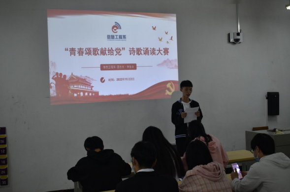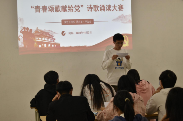 为认真学习宣传贯彻党的二十大精神,激发青年学生爱党爱国热情,赓续红色血脉、传承红色基因,教育引导广大青年学生听党话、跟党走、感党恩,凝聚青年力量、激励青年作为、焕发青春色彩,努力争当新时代奋斗者。信息工程系于11月2日19:00在思泽楼306举行“青春颂歌献给党”诗歌朗诵大赛。