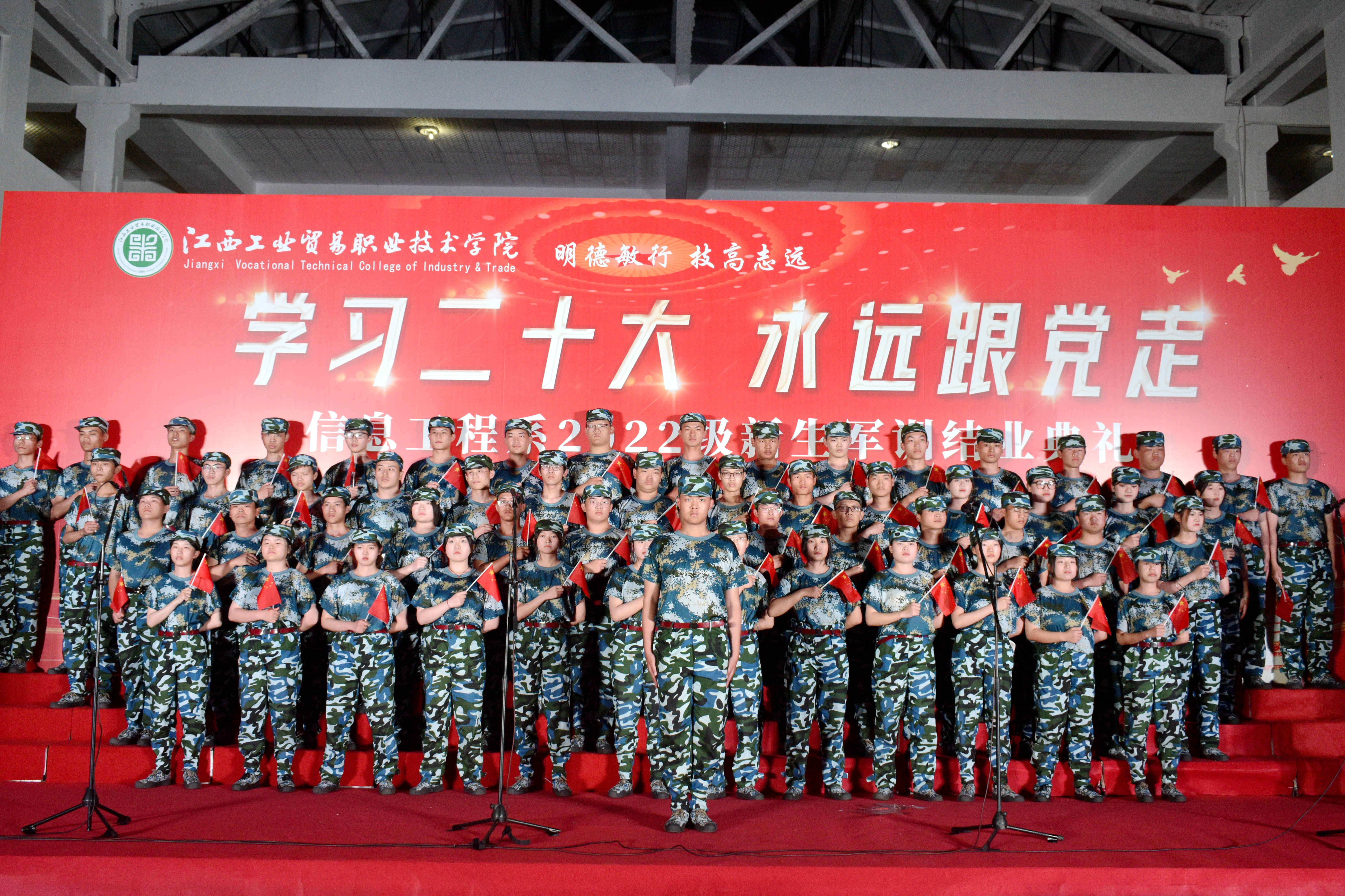 在学院深入学习宣传贯彻党的二十精神的浓厚氛围中,11月9日晚,江西工贸职院信息工程系举行“学习二十大永远跟党走”2022级新生军训结业典礼暨红歌大合唱比赛,学院党委委员、副院长刘国红,党委委员、党委宣传部部长谢继勇,学生工作处处长郑海林、团委书记熊彬,信息工程系主任夏昕、学工副主任陶晓峰、教学副主任熊浩、学生管理员郑婷出席典礼并担任大合唱比赛评委,全体辅导员、全体军训教官及2022级新生参加比赛。